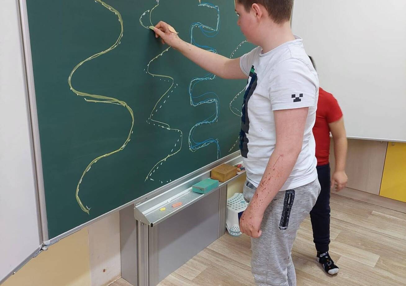 kreslili jsme drakům provázky (grafomotorické cvičení) a také sestavovali dračí ocásky z geometrických tvarů (pravidelné střídání prvků podle vzoru).