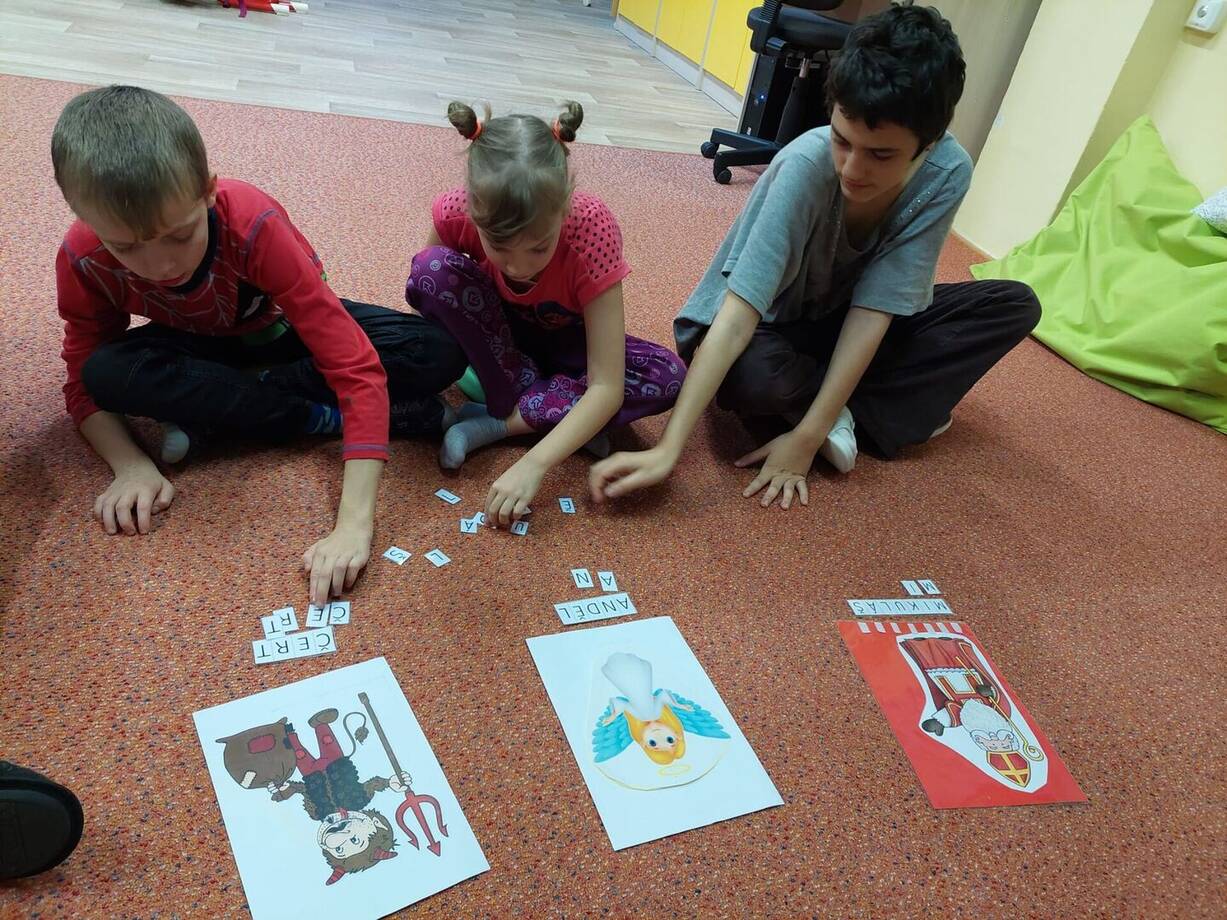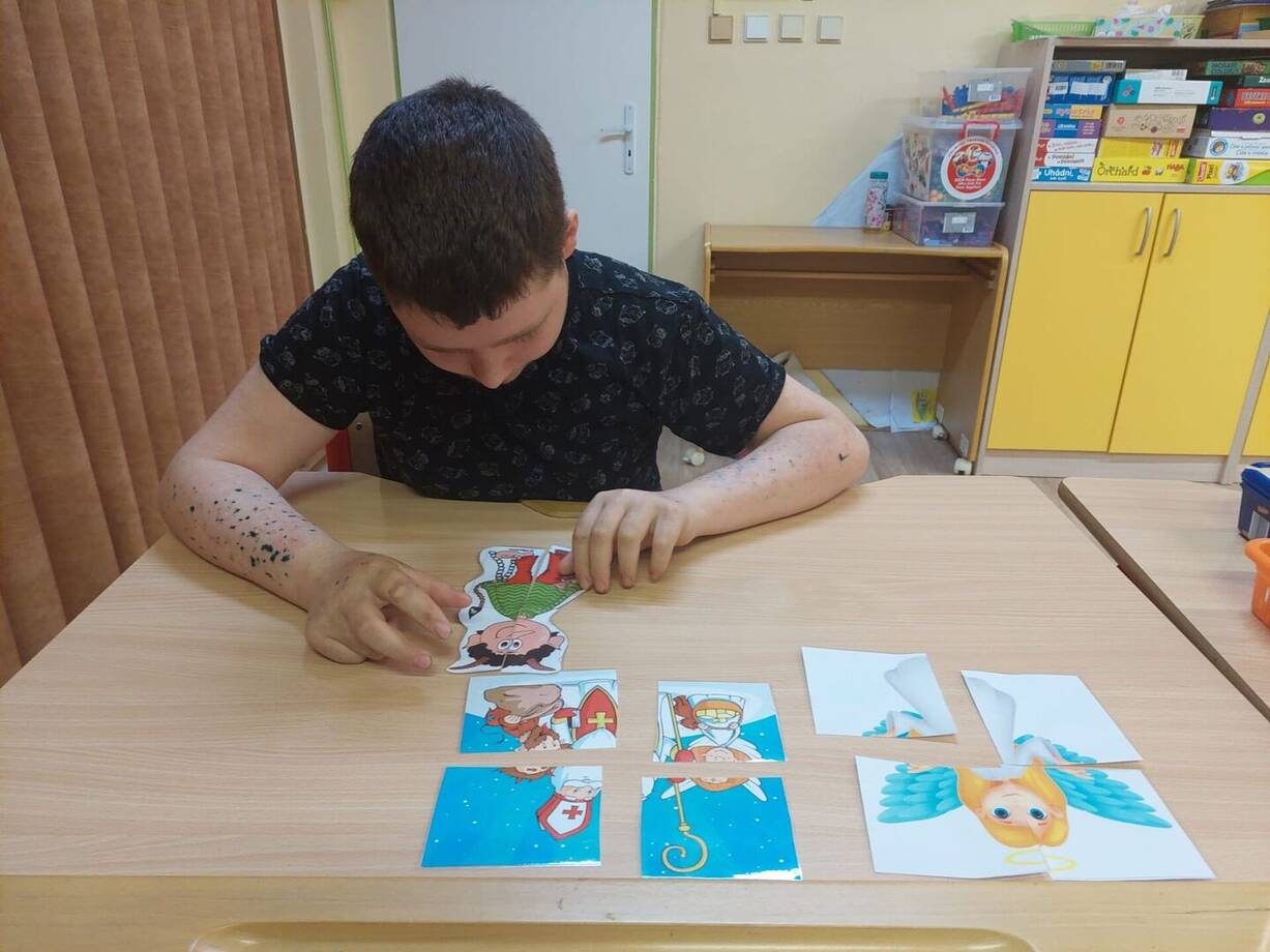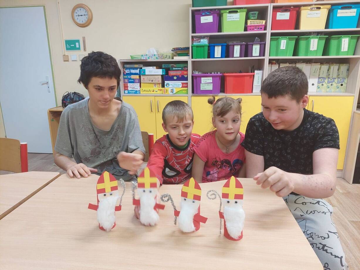 tak se na jeho návštěvu musíme připravit. Procvičovali jsme skládání slov, třídili jsme obrázky - co patří MIkulášovi, čertovi a andělovi, naučili se básničku a čertovský taneček, nacvičovali tvary čertích rohů a Mikulášské berly. Mikuláše a čerta jsme si také společně vyrobili.