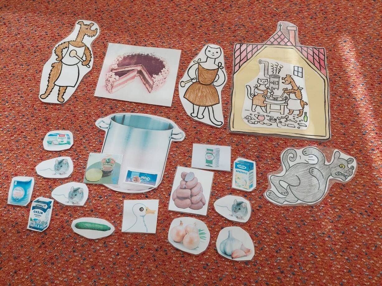 Navštívili jsme divadelní představení O pejskovi a kočičce, které se nám moc líbilo, a tak jsme si i ve škole zahráli pohádku o tom, jak si pejsek s kočičkou pekli dort. A veselou kočičku a pejska jsme si společně vyrobili.
