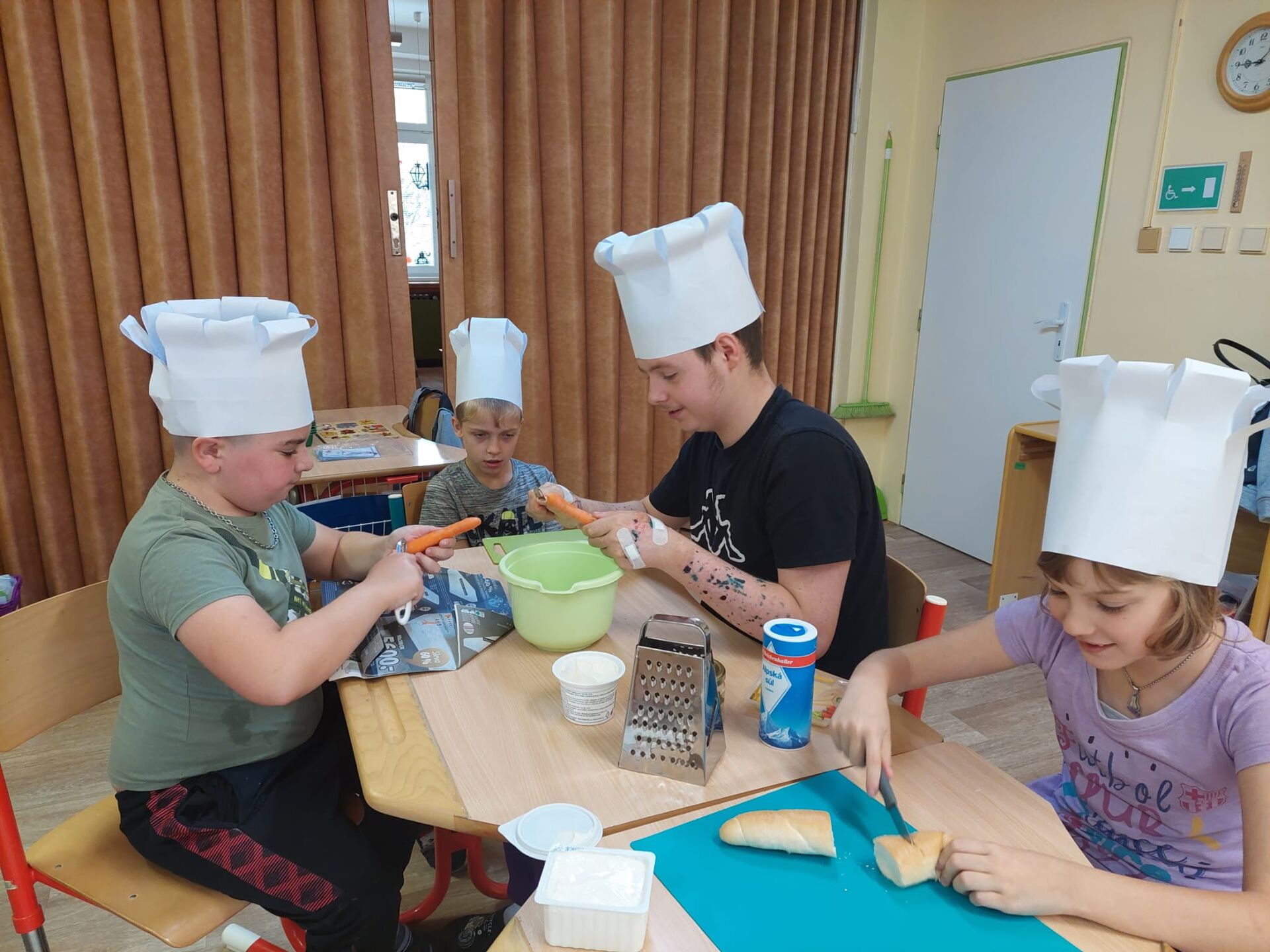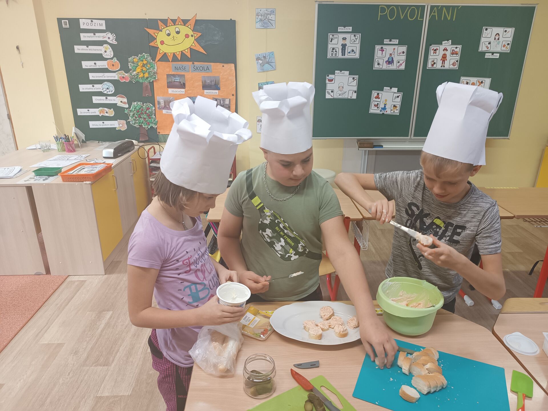 Vyrobili jsme si kuchařské čepice a pustili se do krájení, strouhání, zdobení a nakonec i ochutnávání :-)