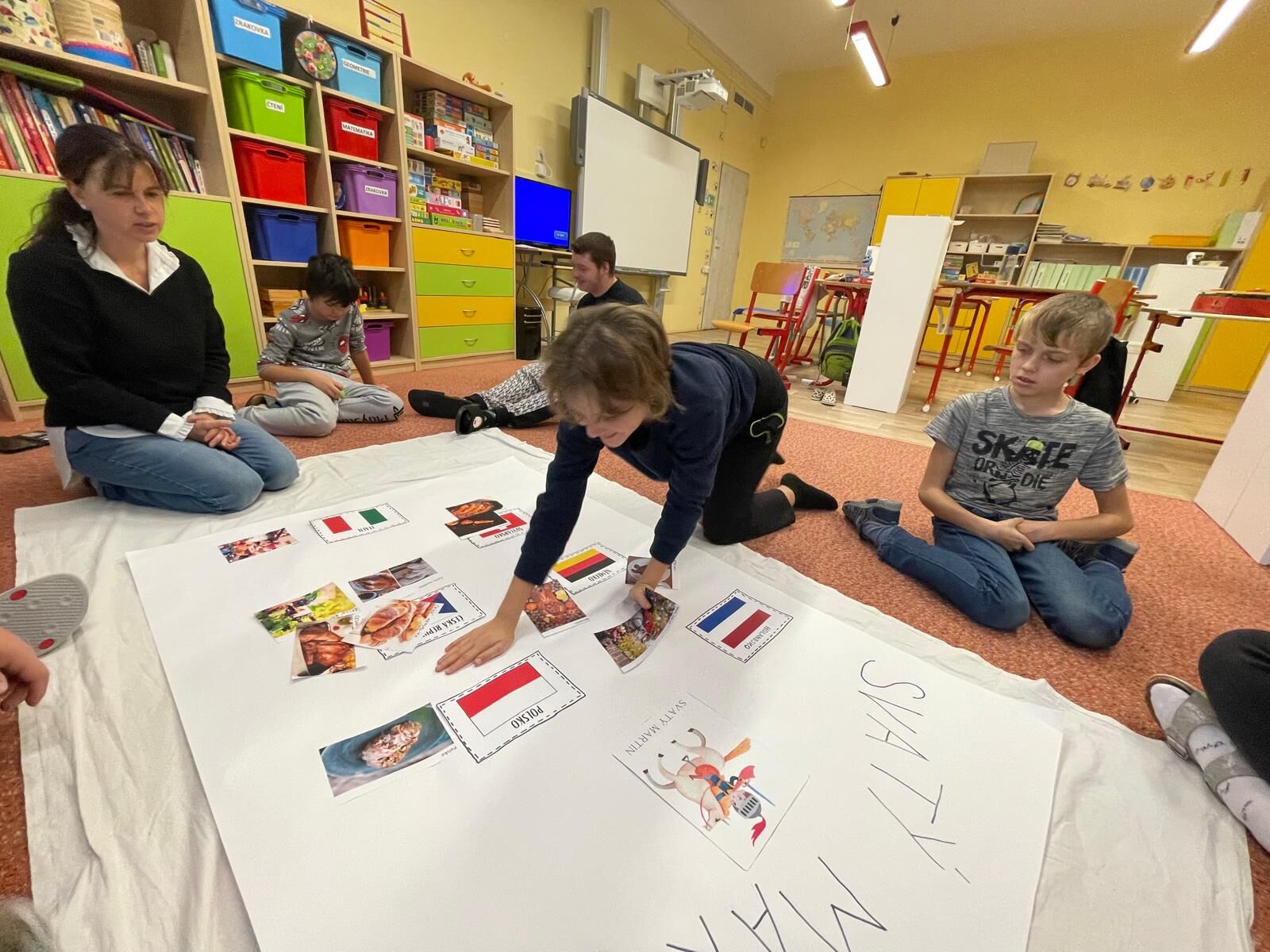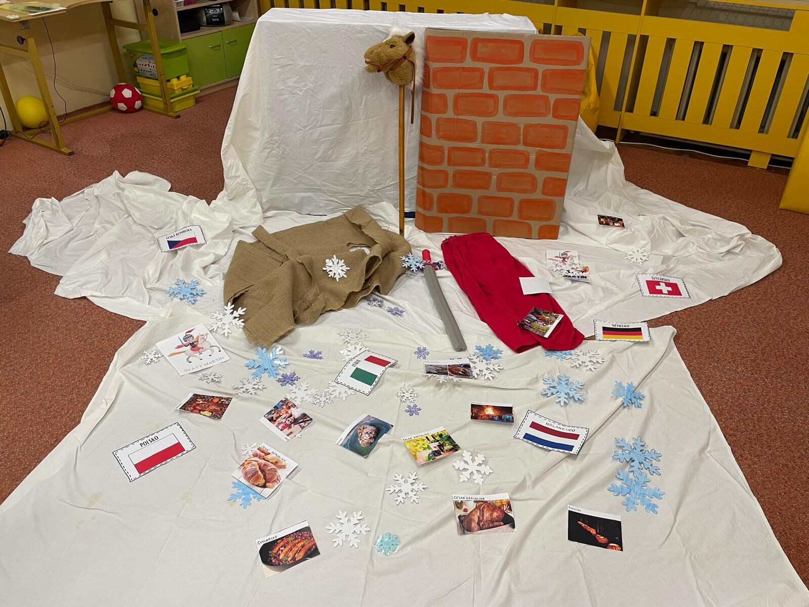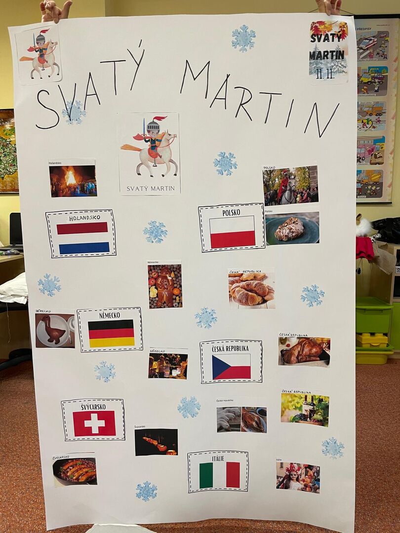 Sešli jsme se splečně se třídou A, abychom si připomněli legendu o svatém Martinovi a tradice, které ke svátku svatého Martina patří. Celý příběh jsme si zahráli jako divadlo, které jsme si všichni moc užili. Pak jsme si prohlíželi a porovnávali fotografie s tradicemi, které se váží ke svátku sv. Martina v evropských zemích. Nakonec jsme společně vytvořili velkou tematickou koláž.