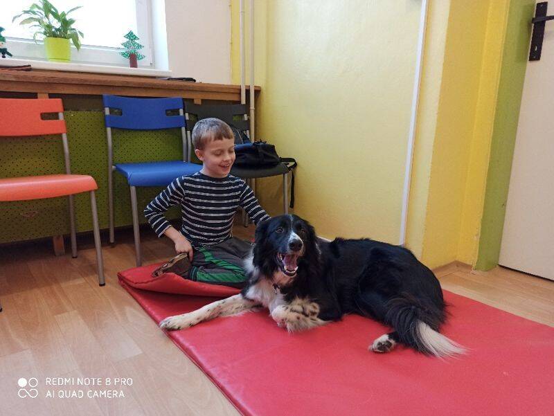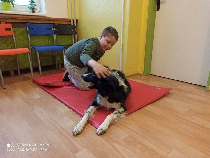 Jedenkrát za 14 dní se všichni těšíme na návštěvu našeho speciálně vycvičeného psího kamaráda, který nám pomáhá při rozvoji jemné i hrubé motoriky, ale i komunikačních dovedností.