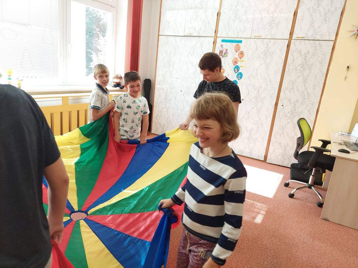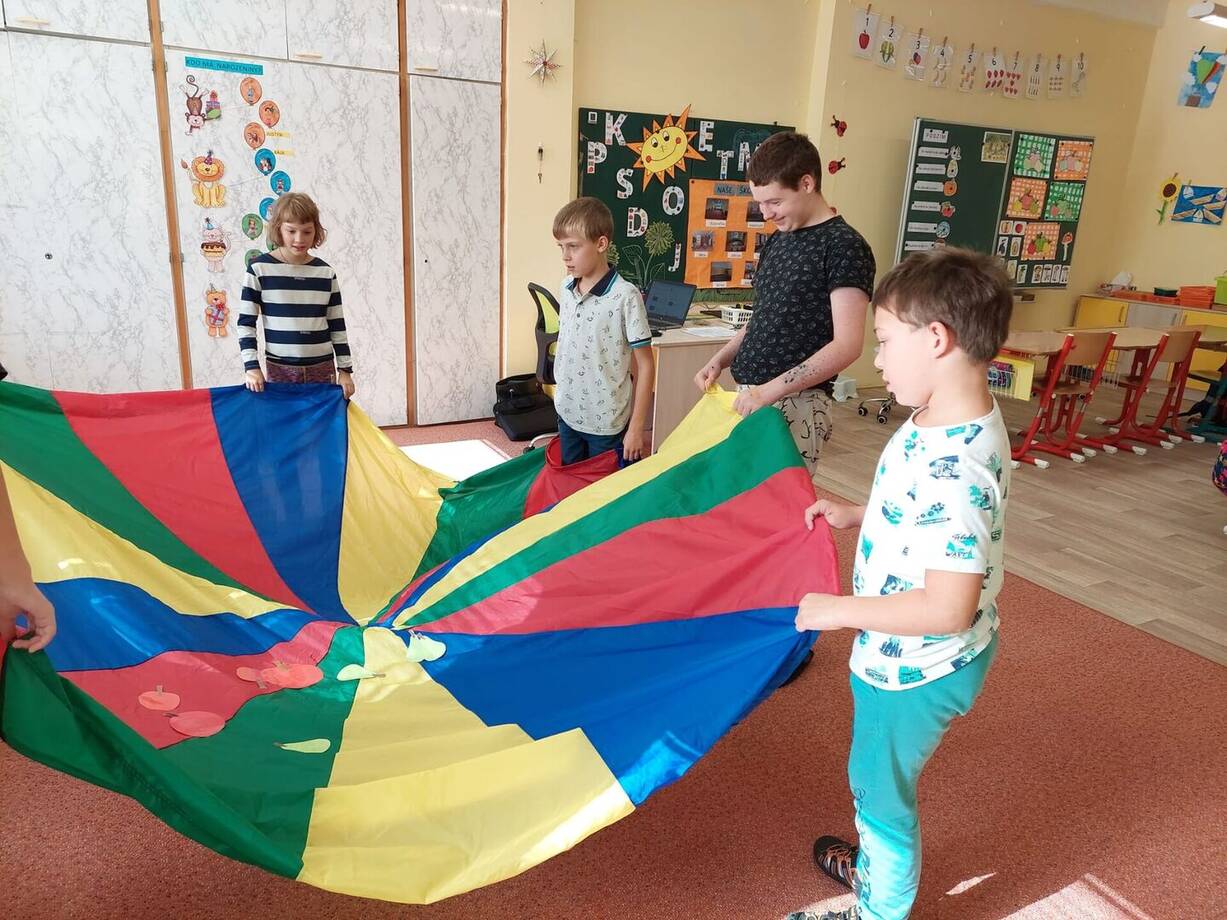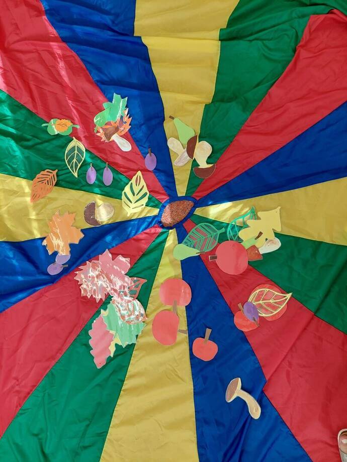se všemi jeho barvami. Připomněli jsme si znaky podzimu, s padákem jsme si zahráli na podzimní počasí a zastavili jsme se na zahrádce, kde jsme sklízeli podzimní ovoce.