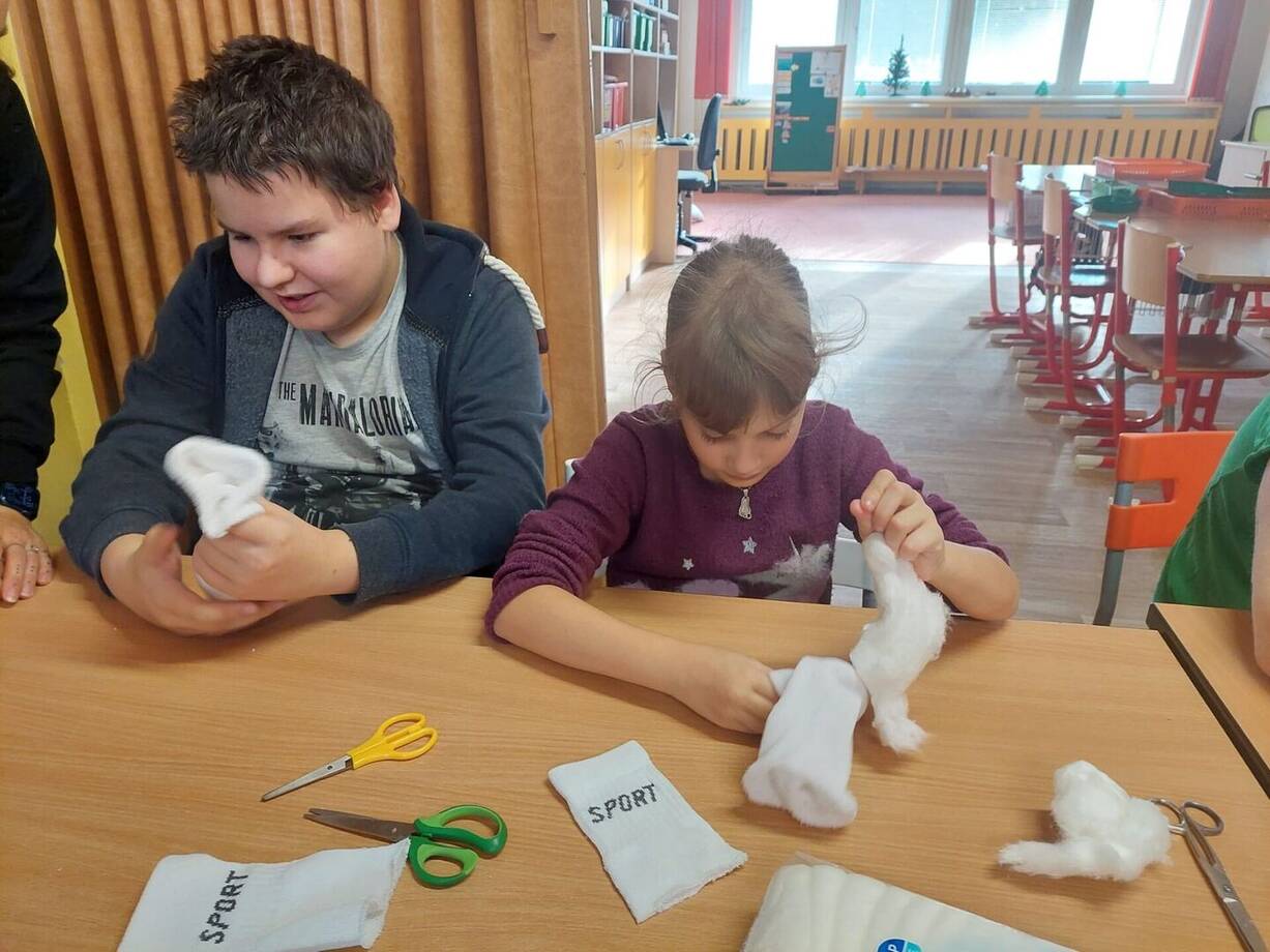 Společně se spolužáky ze třídy A jsme si vyrobili sněhuláky z ponožky, rýže a vaty. Společná práce se nám dařila a také nás moc bavila.
